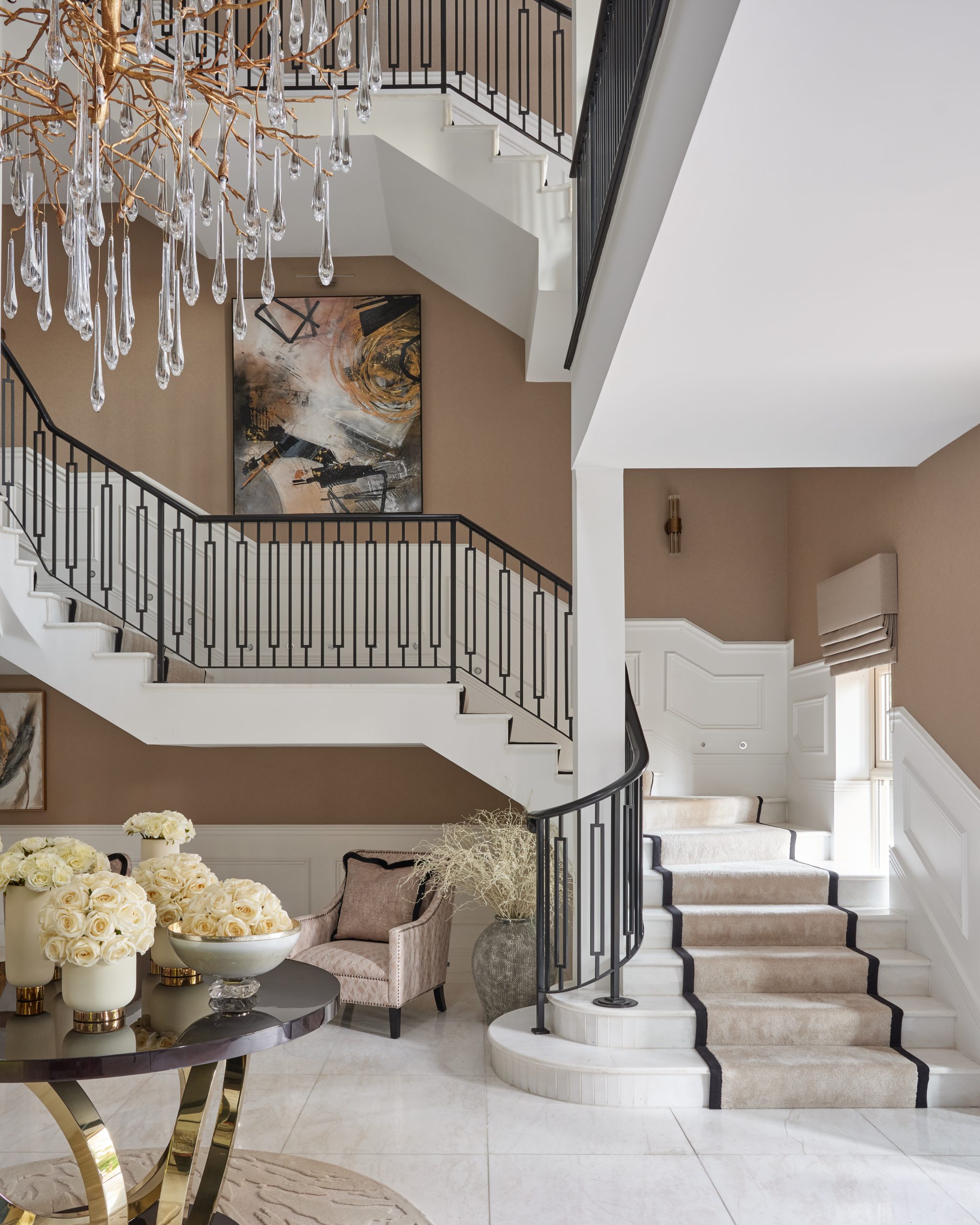 Cox Jones Interiors was commissioned to design the full interior of a 20,000 sqft property. The mansion, situated over three floors, located in the picturesque village of Birstall in the East Midlands. The vision for the 12-bedroom mansion was to create a timeless classic of luxury, characterised by high coffered ceilings, marble flooring, and state-of-the-art home automation by Lutron. Exquisite, high-end exotic woods were meticulously crafted into bespoke joinery. A newly designed home lift added to the mansion's allure, ensuring convenience and accessibility across its expansive floors. Every detail aimed at luxury throughout, set the tone for a sophisticated ambiance.