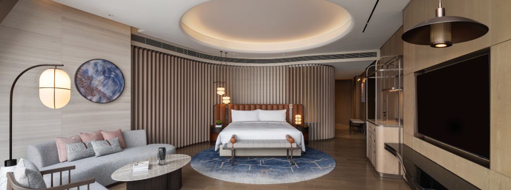 The interior of Hilton Huzhou Nanxun, designed by HBA Singapore, is inspired by the nature of the ancient town and is anchored in a symbiotic relationship between humanity and nature. This design encourages guests to engage, reflect, and immerse themselves fully in the present experience. The guestrooms embody the warmth of autumn, evoking a serene atmosphere through Eastern-inspired spatial design. Features include a round bathtub for a luxurious bath experience and customized furnishings that incorporate local culture. Though the spherical floor-to-ceiling windows, guests can immerse themselves in the ever-changing natural beauty of the waterside throughout all four seasons.