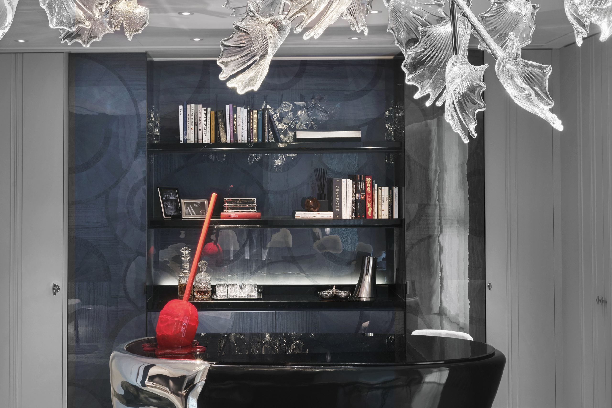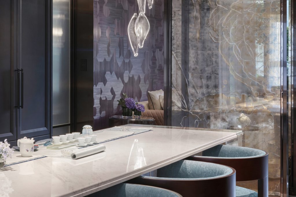 “Artistic Splendor: The Elegant Space of a High-End Service Apartment" From the artful marquetry wall in the living room and the luxurious gold leaf glass-crafted fireplace to the seemingly casual yet thought-provoking installation art, the space exudes a sense of aesthetic living. The owner's love for tea has become a vital element, weaving through the space like strokes on a canvas. Each tea ceremony creates a unique atmosphere, adding a touch of artistry to the surroundings.