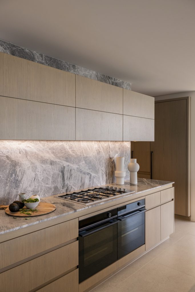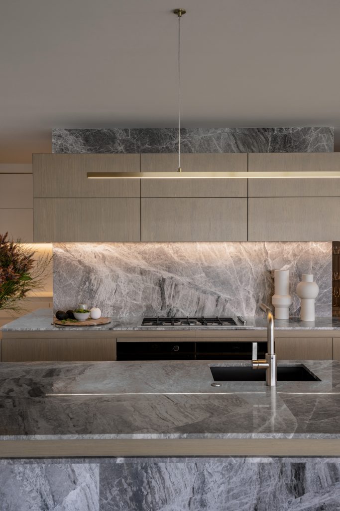 Detail By Davinia Sutton LTD was commissioned to create a large, modern kitchen that could accommodate the needs of a busy family as well as facilitate large social gatherings at a beachside residence. The clients requested a bold design that would sit centre stage to the volume of the living zone and would also encompass a ‘modern beach house aesthetic’ – with a touch of glam. Through a functional layout, interesting play of form and combination of the materials used, this design creates a kitchen with the desirable ‘touch of glam’ that is ideal for daily family living and entertaining.
