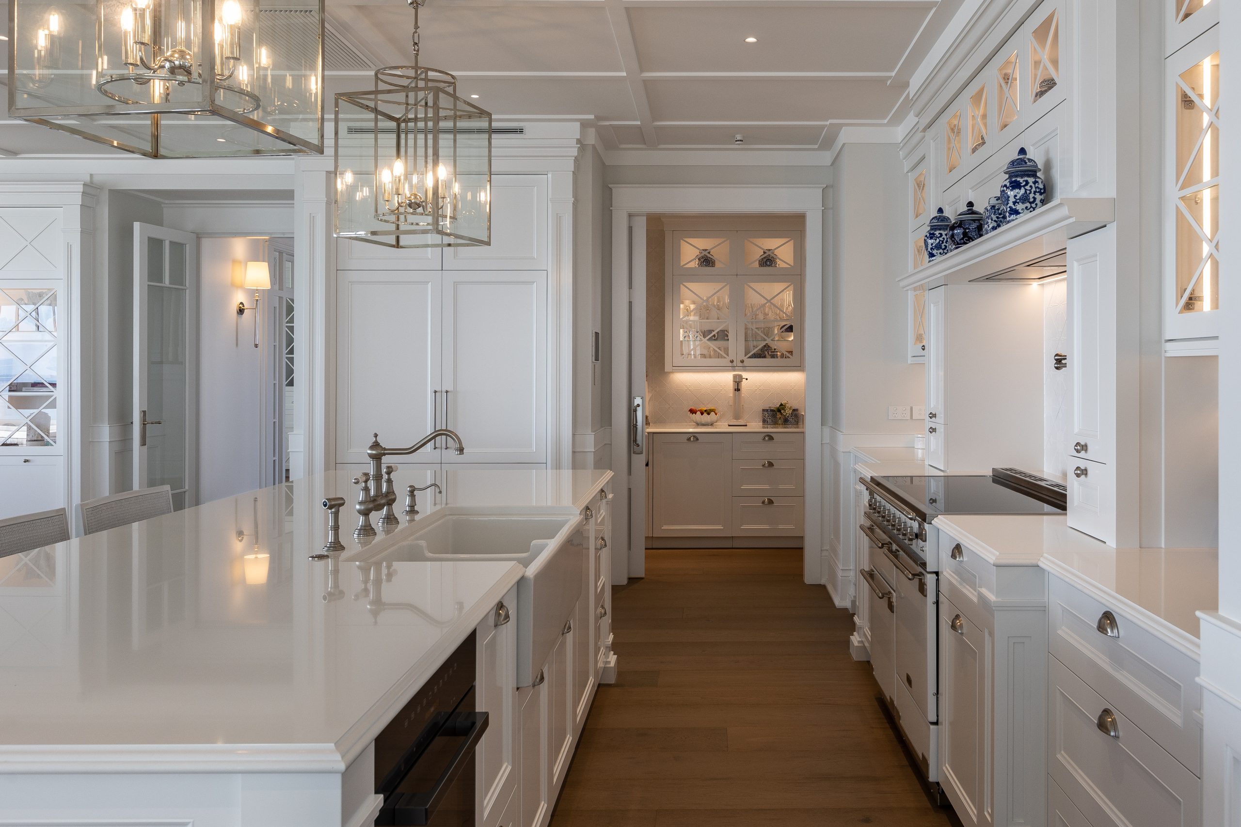 The aesthetic for this elegant and traditional kitchen, was created using detailed mouldings, double beaded doors and glass inserts. Kitchens by Design introduced a very formal design with strong lines and depth to bring it to life. This Hamptons inspired kitchen is bright, light and airy with a coastal vibe, the kitchen makes you feel warm from the moment you walk in. Through attention to every detail, a seamless flow from the kitchen to the rest of the house was achieved.