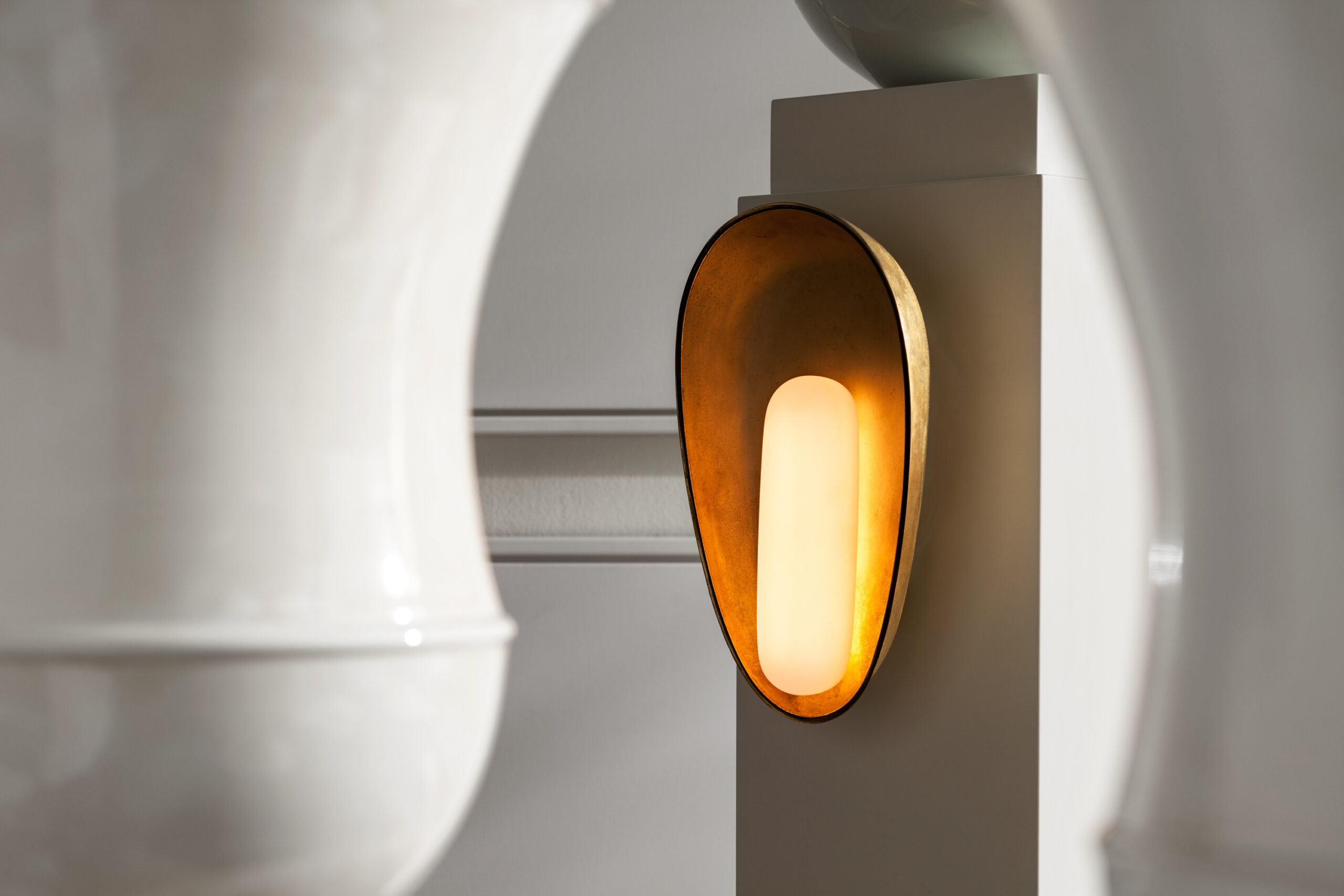 Jake Olivera’s Celeste sconce is a little of both in technical expertise and sublime simplicity. Many sketches were executed to arrive at his abstract interpretation of a Romanesque period depiction of a mother holding her child in an enveloping embrace. Countless technical steps were involved in producing the perfect prototype fixture; including CAD modelling from which a CNC milling machine would create the 3D working model from which the sand cast portion of the sconce would be made. When removed from the mould grinding and hand buffing create various highlights in the metal reflector. A slip cast technique is utilized by the resin studio to create the form which will eventually become the LED light source. With the two elements (mother and child) united, a highly polished lip on the shade’s edge coalesce the textural sand cast metal with the satin smooth bulb to complete the Celeste sconce.