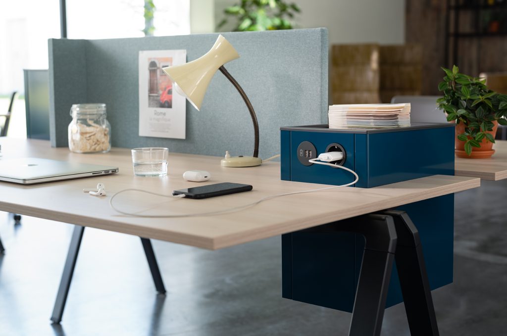 A single or double plug-in box can be mounted onto the tables, its powder-coated metal casing, provides connections for power such as sockets and USB ports. The plug-in box also serves as a lockable storage compartment for personal belongings and valuables. There are also four styles of privacy screens upholstered in different fabrics and a black fabric modesty panel that does not require tools for mounting or removing. All these elements transform the yuno table into a fully-fledged workstation in next to no time. yuno office is a simple, comprehensive and flexible solution that combines work surfaces, privacy, storage and cable management.