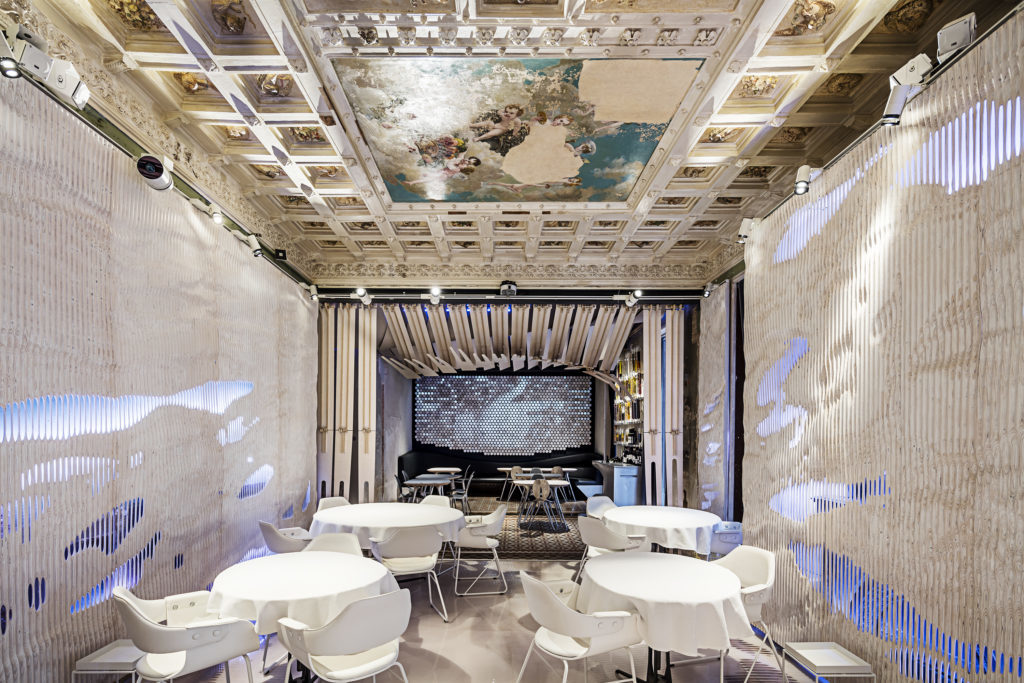 The restaurant Alkimia has been conceived of as a continuous scenography fostering a seamless sensory experience. The different parts of this scenography feature sea life-inspired skins, art installations and custom-made furniture which establish a unique relationship with the surrounding space.