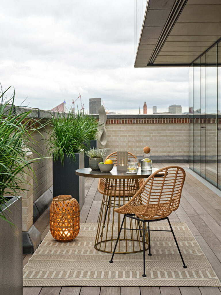 The apartment is one of the luxury apartments built in the iconic Battersea Park Power Station building. It boasts a spacious terrace with stunning views of the London skyline. The layout was carefully considered to maximise the use of the space and make it an extension of the interior with understated luxury furniture that is durable and comfortable.