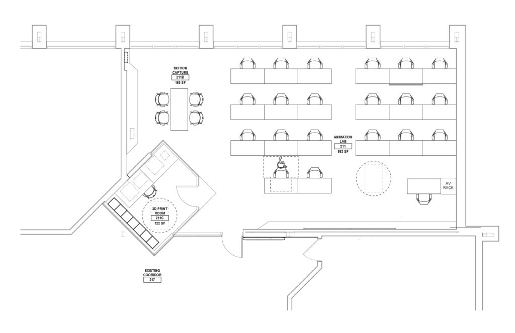 The university’s first major investment in renewing its aging 1960s arts building, the new animation lab combines a formerly separate classroom and computer lab into a single multifunctional space. Now, glass walls invite passersby into a community of 3D modeling and making, supported by a computer lab, 3D printing lab, and flexible space with whiteboards for collaborative work, student critiques, or motion capture.