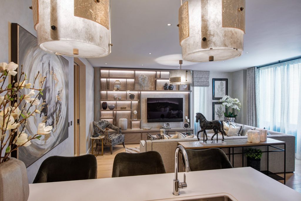 Complementing the elegant features of the beautifully finished new build apartments overlooking the exclusive, picturesque courtyard, the design studio injected the apartment with a magnificent collection of opulent fabrics, high-end furnishings, distinct accessories, and bespoke artwork, perfect for open-plan living.