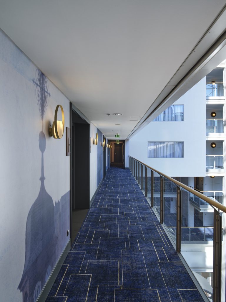 Urban Loft Living. Frankfurt is known as ‘Mainhattan’ because of its skyline and its closeness to the river Main, so the concept of the hotel lobby was ‘Urban Loft Living’. The interior features dark contemporary tones, custom made and decorative lighting, with strong touches of sophisticated colour. The bar top is in Verde Alpi Stone and the check-in is Rosso Levante stone; both adding an upscale residential touch – similar to an apartment lobby on Fifth Avenue. The check-in area was completed as part of a major refurbishment of the hotel accommodation, conference, events and finally, the lobby.