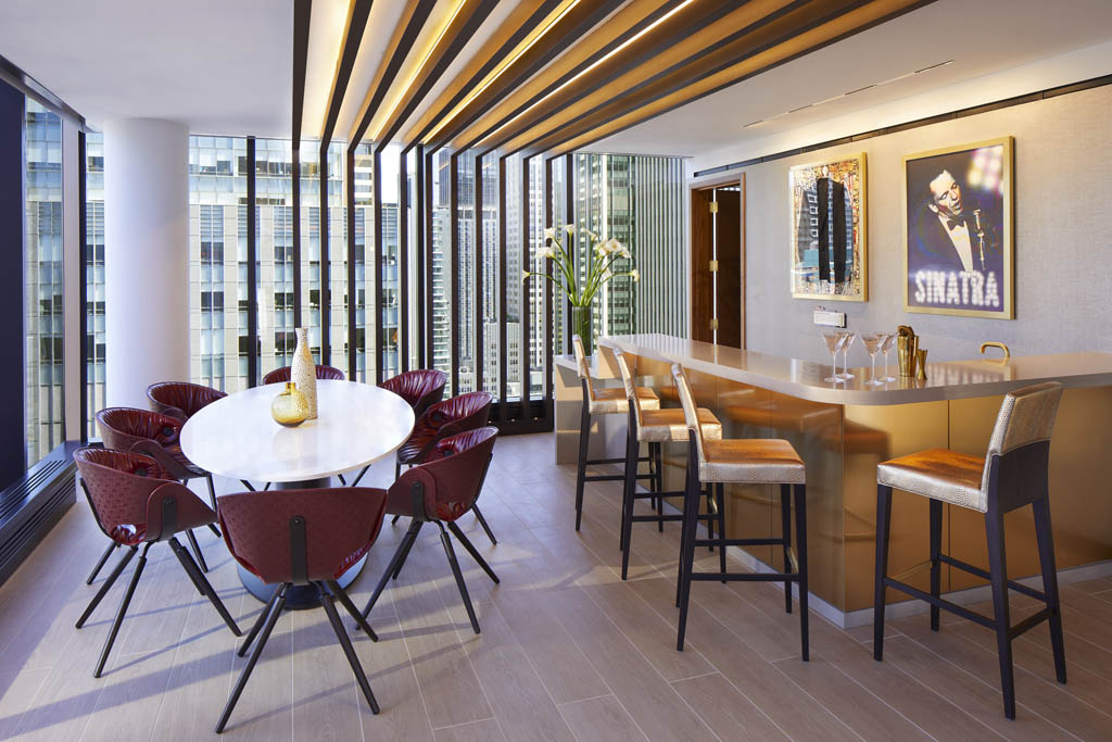 Sitting atop the 36th floor is the jewel of the Rock Star Suite, a glass-enclosed penthouse with expansive city views, original contemporary artwork, bespoke music memorabilia, and one of the largest terraces for entertaining in New York City at 1,600 sq. ft. The sleek interior design includes double height ceilings and rich tones and textures creating an inviting and timeless space. On its first level, the suite features an open-plan living and dining area with a bar and butler pantry, and an outdoor bar. Guests can retreat upstairs to a luxurious bedroom area with a walk in closet and contemporary bathroom featuring a red free standing bathtub.