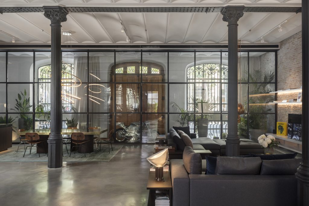 Situated in one of the most iconic Modernist buildings, the loft adapts its historic space to contemporary use as a habitable, sophisticated home. Private zones were separated from the living area with a wooden clad ‘box’ and the gallery featuring industrial glass windows was included for enhanced privacy. All original pillars supporting the 4 metre height ceiling remained exposed and the rooms were developed around them. KSD designed almost all furniture custom to the place and person, not only in size but also in context, legacy and aesthetic. Main materials include veneered varnished chestnut, natural stone and original brick. Green marble was paired with elements in untreated brass that will age naturally developing a beautiful patina. KSD focused on specific qualities and tactility of materials, alternating textures cold with warm, glossy with raw, soft with hard.
