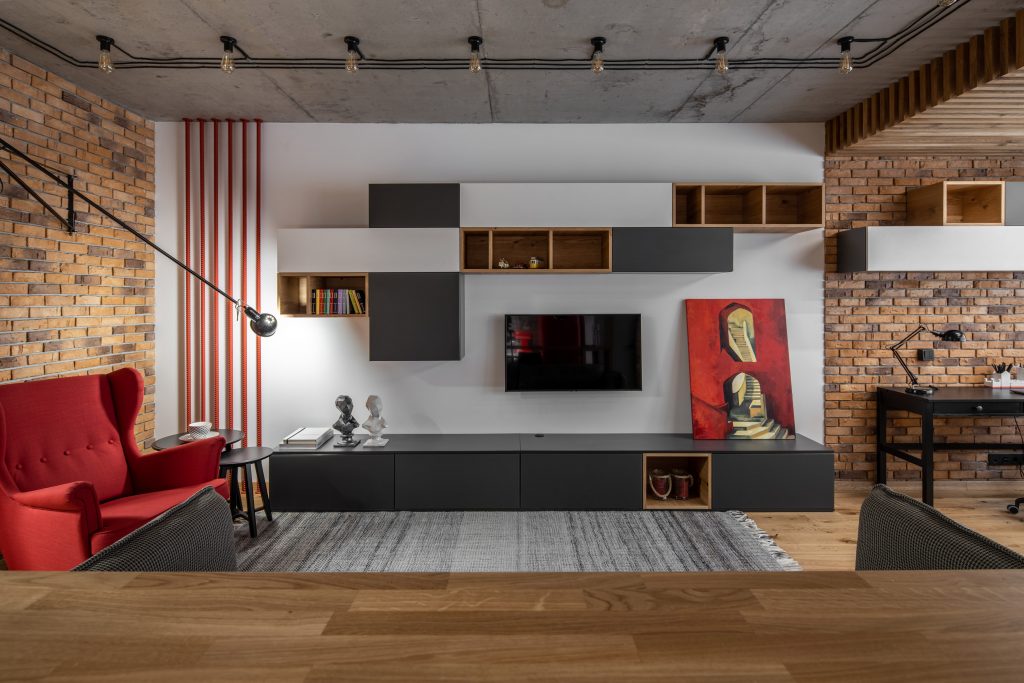 The entire guest area of the apartment is designed in one colour scheme – graphite grey with red accents, natural wood and brick. In the private area of the apartment there is a bedroom with a dressing room and a private bathroom. The colour scheme of the bedroom is more calm and soft, in grey and beige tones.