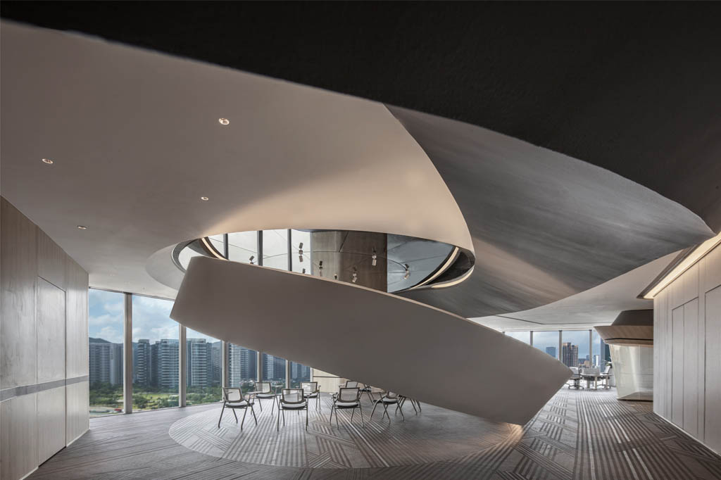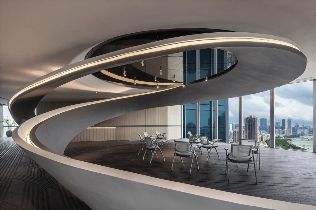 The project is located in the belly of the Greater Bay Area, which is a new business highland on the west bank of the Guangdong-Hong Kong-Macao Greater Bay Area. The office occupies the whole floor of the office building, the visual field can reach to 360 degrees with unique landscape vision and good lighting conditions.Designer continues to explore the limits of structure and modeling and breaks the vertical composition of space. On the basis of visual aesthetics, the designer has reopened the new interface of the city skyline with bold curve elements.