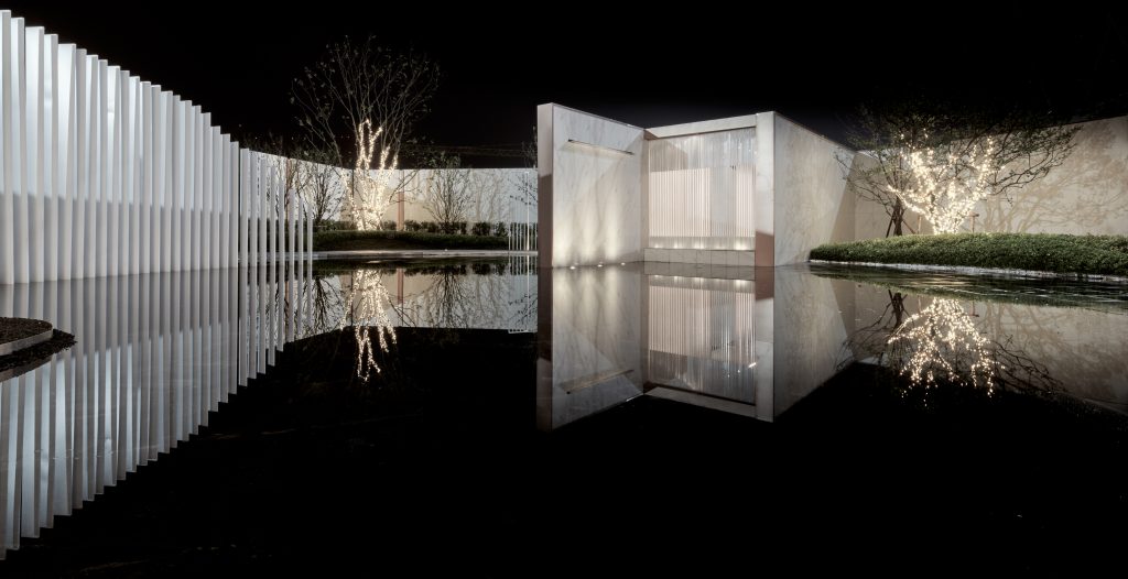 The sales centre space is designed to largely focus on functions, complemented and harmonised with local culture and the natural environment. The grey and white building looks modern with vertical textures. With an irregular, distinct appearance, it is also surrounded by water. It reshapes the relationship between architecture and nature with the concept of showing respect to the natural environment.