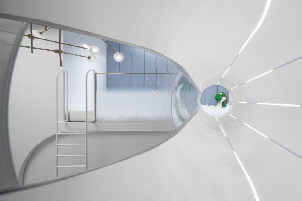The Shangkun Yueshan Peninsula Project is located in Sheshan Plate, Songjiang District, Shanghai, an area surrounded by mountains, rivers and shade, all of which are aspects of island life that city dwellers desire when escaping urban living. The concepts of art and home were the starting point of the project. Using advanced colours, changeable space and concise lines; the design paints a picture of the modern dweller’s art and life intertwined. The most interesting feature is the ‘pipe’, which gives the project a more playful feel and an artistic edge; it makes the whole design more individual and dynamic. The whole underground space uses design to create a joyful feeling. It’s an amusement park and an art salon; the space is staggered and the joy here is extraordinary.