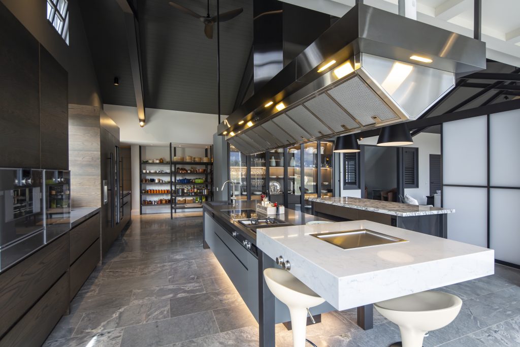 Masterwood’s fusion of oriental and commercial chic successfully interpreted the design brief for this magnificent Queenstown home. Clean, straight lines, natural materials and earthy tones set the scene. In juxtaposition to traditional Chinese sliding screens separating the kitchen from an informal lounge area, heavy-duty steel box section legs support two islands with a commercial stainless steel kitchen extractor suspended above the chef’s island. The chef’s island has a cantilevered teppanyaki grill mounted in Caesarstone, while the pastry island has an outstanding marble work surface. A favourite place in the kitchen is the self-contained coffee station affording sweeping views of The Remarkables mountain range. The six-door glass fronted display cabinet effectively distracts the eye from two pantry areas, including a fully equipped butler’s pantry. True to the oriental theme, form and function are in perfect harmony in these pantries.