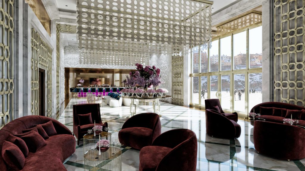Taj Banqueting is a contemporary wedding and events space that has taken shape from all the clichés one would come to expect when referencing India. The design team began the journey with a famous quote from legendary fashion editor Diana Vreeland who said: “Pink is the navy blue of India”. To create an entertaining space, the designers visually referenced the marble of the Taj Mahal, the colours of Rajasthani Royal Court and the Kundan work jewels of the Mughal era. Stage sets are a key focal point to any Asian wedding and the designers took a contemporary approach by incorporating digital projector screens similar to those used on popular TV shows such as Dancing on Ice. The visuals were bought to life by using software from Rhino 3D, V-Ray for sketching, SketchUp and Adobe Photoshop. The resulting images communicate the glamour and theatre one would expect for an Asian wedding.