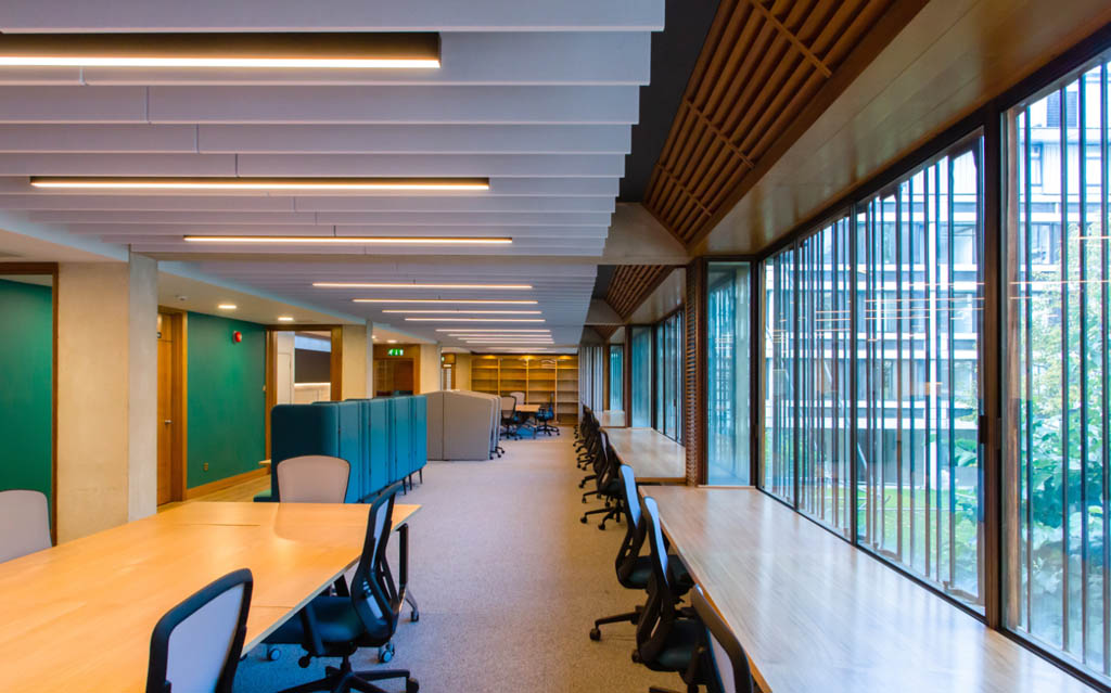 Layrd Design were engaged to design the full interior scheme and specify all furniture, joinery and finished for this new study space at The Armitage Rooms, Queens College. The new space is light, open and inviting for students to come and work individually in acoustic booths or as teams on larger flexible tables. New acoustic baffles create a design feature throughout the space whilst also adding significantly to the acoustic performance of the space.