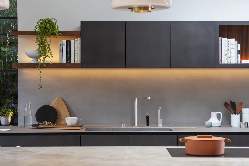 A Taj Mahal Quartzite clad island is teamed with wall cabinetry in a dark pigmented concrete finish and combined with a hot rolled steel worktop in this open plan bespoke kitchen designed by Eggersmann Design.